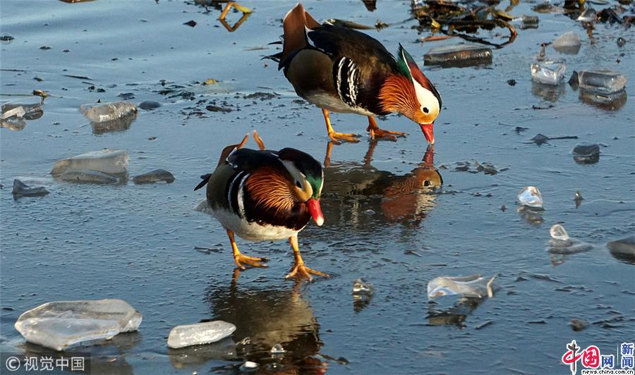 北京:鸳鸯冬日扎堆玉渊潭 戏水觅食萌态十足