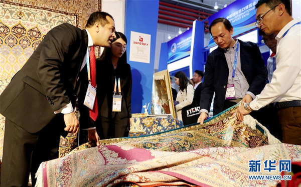 2018年11月5日,在上海举行的首届进博会上,一位来自伊朗的展商(左)向参观者介绍波斯地毯。新华社记者方喆摄