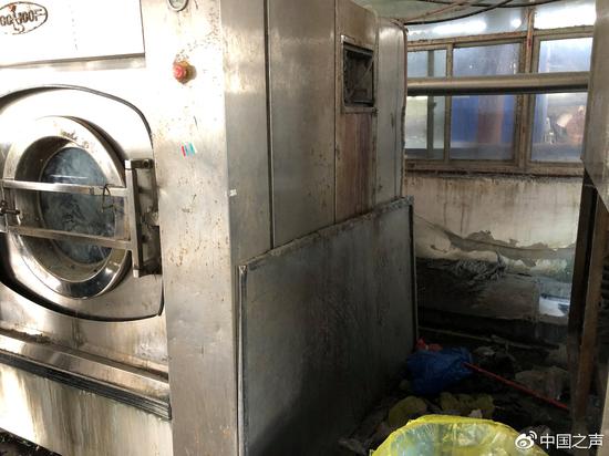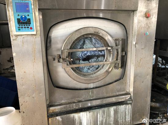 记者在工厂内还看到,十几台大型洗衣机内白色、蓝色的医疗布草正在混合滚动,由于密封不严,时不时有深颜色水柱流下来,洗衣机上布满了污垢,旁边堆放着“超浓缩助洗剂”的大桶,地上可以看到污水横流,卫生条件令人担忧。