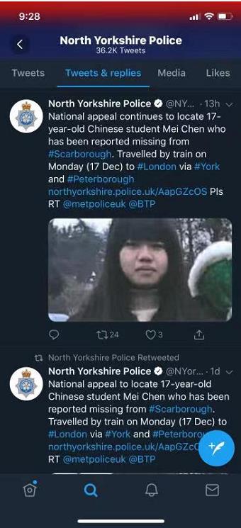 北约克郡警方在其网站以及推特上发布消息,称失踪女孩名叫Mei Chen(陈梅,音译),自2018年10月21日抵达英国以来,一直在斯卡伯勒国际学校学习。