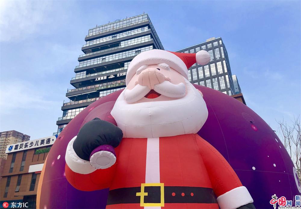 2018年12月24日,河南郑州,为2018迎圣诞节,一巨型充气式的“圣诞老人”矗立在郑东新区一广场上,圣诞老人背后的大袋子有一层楼高,憨态可掬引围观。石光明/东方IC