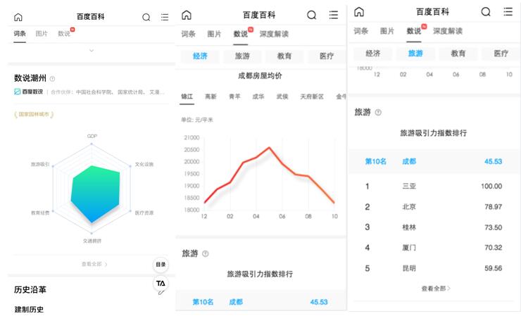 “百度数说·城市”是数说在城市方面的应用。城市是一个综合体,其中的信息庞杂而海量。“百度数说·城市”正是联合国家统计局、百度地图、百度知识图谱、携程、贝壳(链家)等权威数据方,依靠百度AI将数据结构化、可视化地呈现给用户,从而高效、直观地满足用户需求。比如:打开百度百科的“成都”词条,用户可以通过经济、教育、医疗等几个核心指标了解成都;也能看到成都房价变化;可以看到旅游吸引力指数排行,成都的旅游指数排名,以及成都游客的人群画像和行为信息等更细微的数据,几张图表就能看穿一座城。
