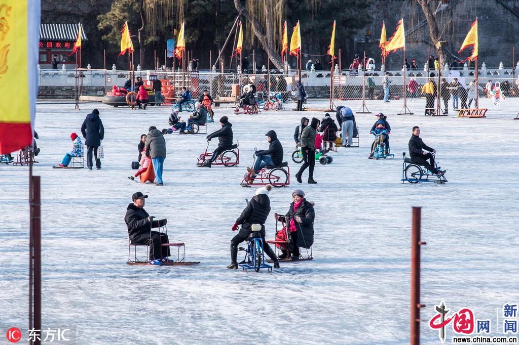 2018年12月31日,北京,元旦前夕,北海公园冰场开门迎客,众多市民利用假期到北海滑冰、玩儿冰车,玩儿的不亦乐乎。 北海冰场位于公园南岸的荷花湖,并且面积达到了一万五千多平米。每年冬季都会有大量市民到这里体验冰面上的游戏,冰上自行车、碰碰车,穿着冰鞋在冰面上随意舞动着身躯。不仅为枯燥的冬日带来一份乐趣,更为假日里增添了丰富多彩的生活,还能锻炼身体抵御冬季的严寒,对于生活在这里的老北京人来说,更是童年的记忆。