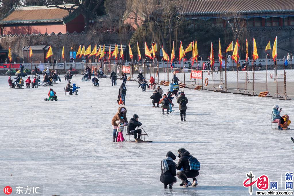 2018年12月31日,北京,元旦前夕,北海公园冰场开门迎客,众多市民利用假期到北海滑冰、玩儿冰车,玩儿的不亦乐乎。 北海冰场位于公园南岸的荷花湖,并且面积达到了一万五千多平米。每年冬季都会有大量市民到这里体验冰面上的游戏,冰上自行车、碰碰车,穿着冰鞋在冰面上随意舞动着身躯。不仅为枯燥的冬日带来一份乐趣,更为假日里增添了丰富多彩的生活,还能锻炼身体抵御冬季的严寒,对于生活在这里的老北京人来说,更是童年的记忆。