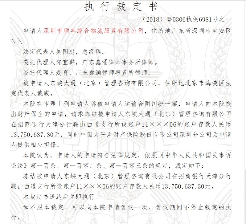 据中国裁判文书网2018年12月30日披露信息显示,深圳市顺丰综合物流服务有限公司向广东省深圳市宝安区人民法院提出财产保全的申请,请求冻结被申请人东峡大通(北京)管理咨询有限公司(以下简称“东峡大通”,其为ofo小黄车运营主体)在招商银行天津分行鞍山西道支行所设账户11×××06的账户存款人民币1375.06万元,同时中国太平洋财产保险股份有限公司深圳分公司为申请人提供相应担保。