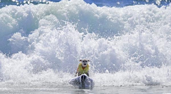 2018年9月29日,一只小狗在冲浪比赛中。当日,美国加州亨廷顿海滩举行狗狗冲浪大赛。狗狗们乘风破浪,“酷炫”十足。新华社 李颖 摄