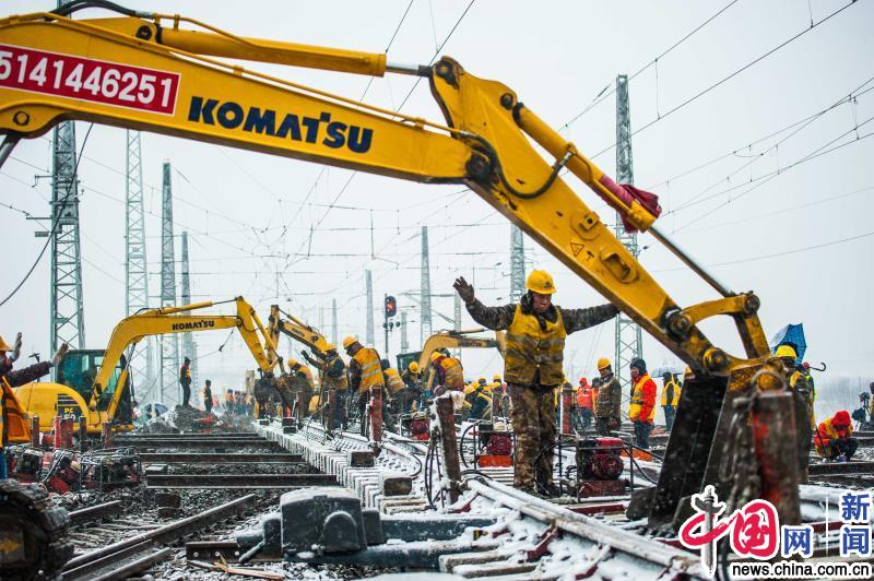 中国网1月10日讯 1月9日,由中国铁路上海局集团公司组织千余名铁路建设者,经过225分钟雪中鏖战,将既有阜六上行联络线拨接至阜阳北站新建五场6道,顺利完成微机联锁设备及更换相关车站联锁软件、接触网改造等施工,标志着阜阳北站扩能工程第五阶段第一步新建五场开通启用,为阜阳枢纽形成强大的运输能力提供了强有力的保障。