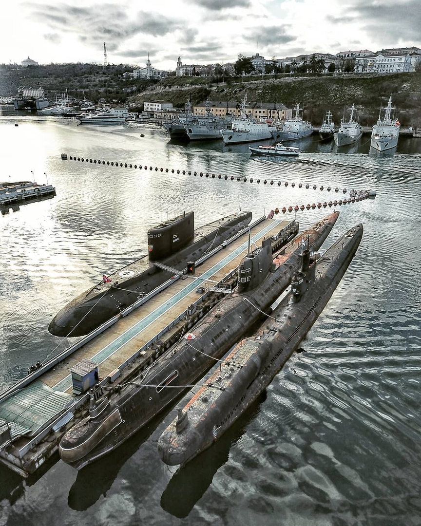 俄罗斯摄影爱好者拍下了克里米亚半岛港口城市塞瓦斯托波尔的俄军潜艇部队停靠在码头的场景,该基地也是俄罗斯黑海舰队司令部所在地。除了现役的俄军潜艇外,码头上还停放着几艘已经锈穿的退役老式潜艇,满满的破败感。