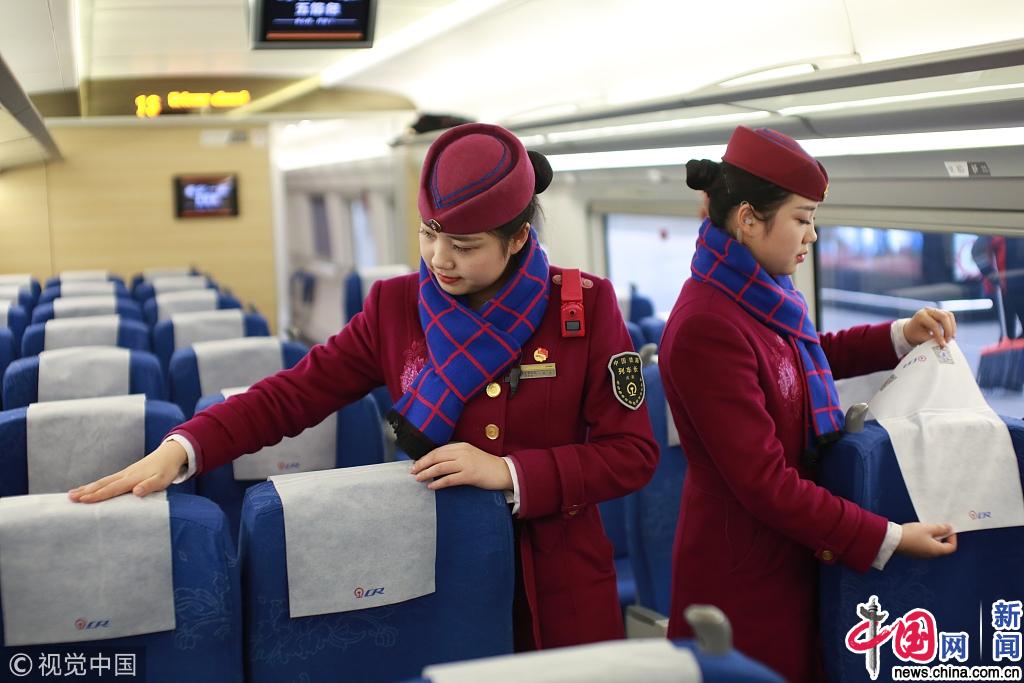 图为2019年1月20日,在G8508次列车上,在列车达到车站后,利用间隙时间李清(左一)和李洁一起调整座位及头巾片等,来迎接忙碌的旅客服务工作。苏志刚 /视觉中国