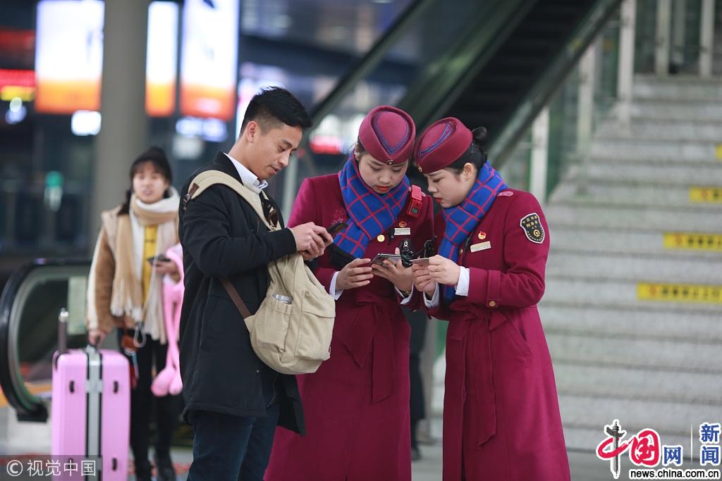 图为2019年1月20日,在成都东站的站台上,李清(左二)和妹妹李洁一起为旅客服务。苏志刚 /视觉中国