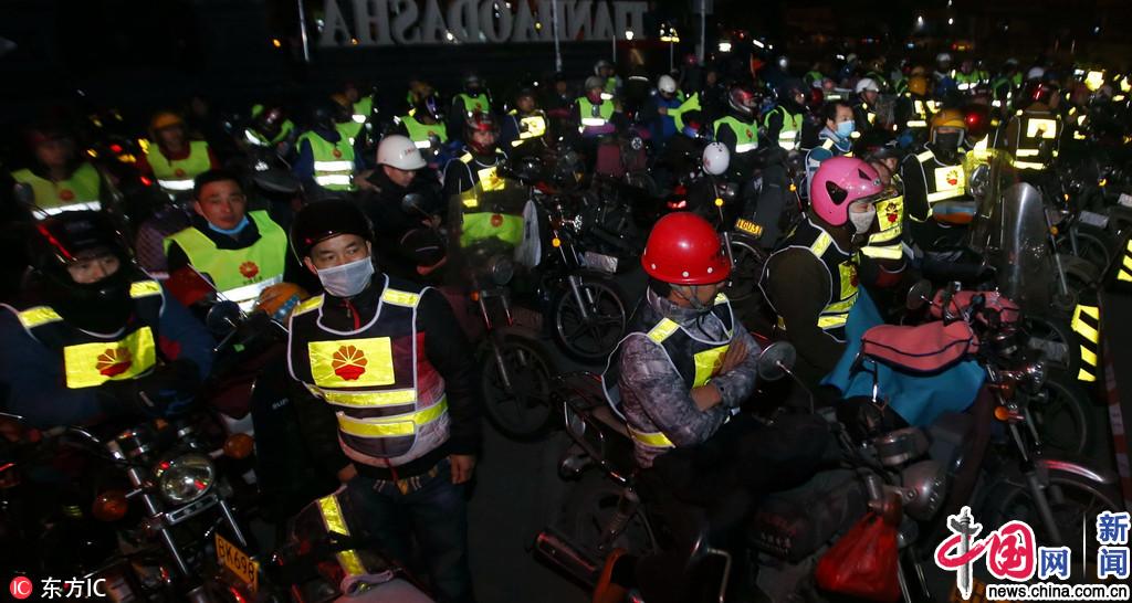 2019年1月21日6时30分,返乡过年的428辆摩托车、513人从福建泉州、厦门、福州、漳州四地出发,踏上千里返乡路。今年,福建、湖南、江西、湖北、广西、浙江、贵州七省联动,帮助铁骑返乡。铁骑返乡经过的121座中石油加油站设置为爱心驿站,返乡铁骑可以获得免费加油、免费快餐、免费姜汤热茶、免费交通反光背心、免费交通意外险(保额20万元)、免费围巾、免费地图、帮助联系摩托车修理、帮助提供手机充电、帮助提供铁骑休息点。图为福建,七省联动助农民工铁骑返乡,出发集结。江南都市报视觉中心/东方IC