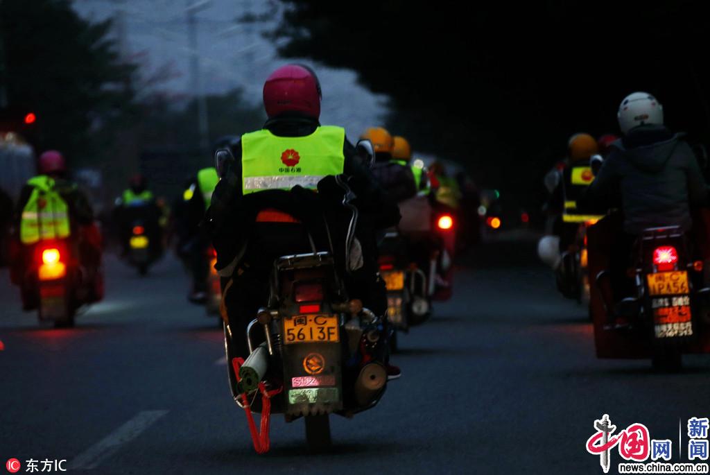 2019年1月21日6时30分,返乡过年的428辆摩托车、513人从福建泉州、厦门、福州、漳州四地出发,踏上千里返乡路。今年,福建、湖南、江西、湖北、广西、浙江、贵州七省联动,帮助铁骑返乡。铁骑返乡经过的121座中石油加油站设置为爱心驿站,返乡铁骑可以获得免费加油、免费快餐、免费姜汤热茶、免费交通反光背心、免费交通意外险(保额20万元)、免费围巾、免费地图、帮助联系摩托车修理、帮助提供手机充电、帮助提供铁骑休息点。图为福建,七省联动助农民工铁骑返乡,带着大包小包回家。江南都市报视觉中心/东方IC