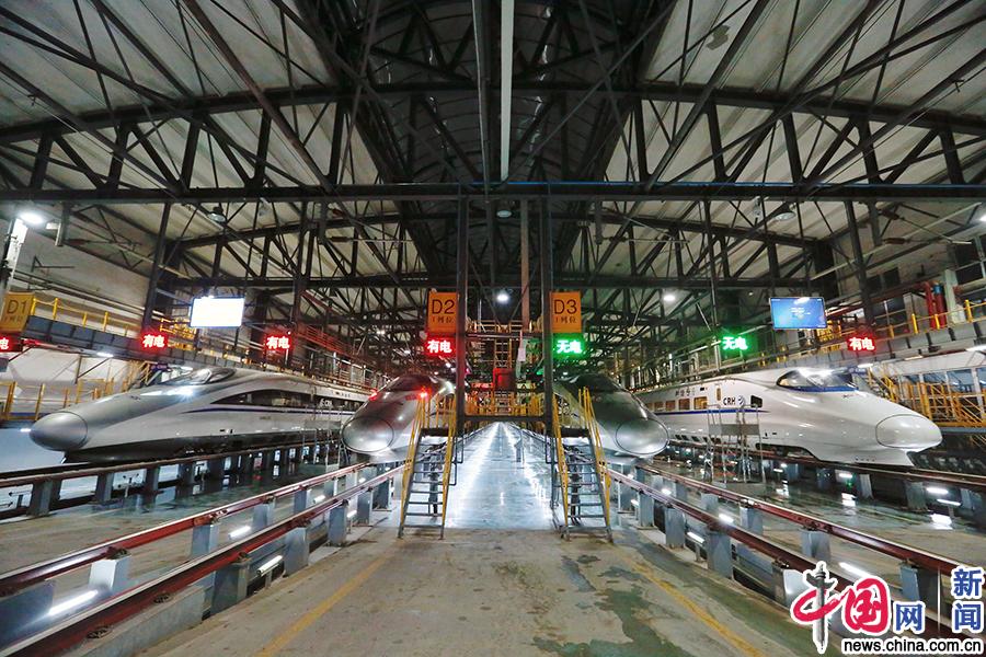 四列动车组停放在南昌西动车所检修大库内进行检修。中国网发 丁波/摄