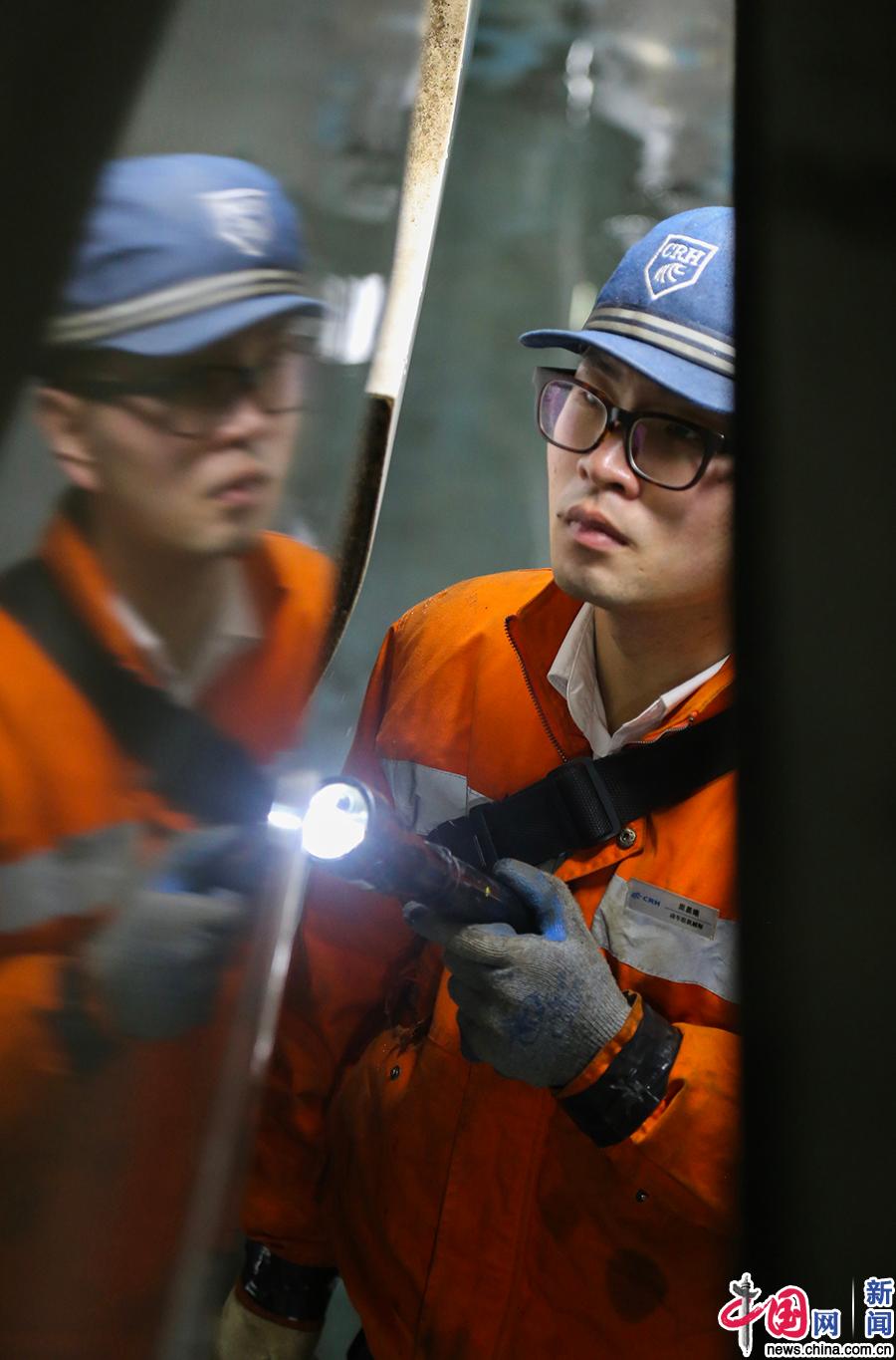 动车机械师正在对动车组进行车体外观检查。中国网发 盛德权/摄