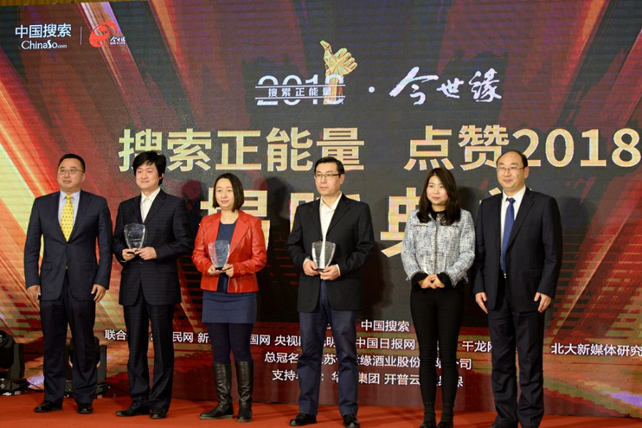 “搜索正能量 点赞2018”大型网络宣传活动揭晓典礼今天在北京举行。现场揭晓了展现2018年中国发展进步的新闻热词、感动人物、精彩故事等榜单,并启动政务搜索服务平台。图为活动现场颁奖仪式。中国搜索丘玲玲 摄