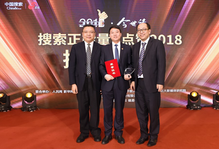 “搜索正能量 点赞2018”大型网络宣传活动揭晓典礼今天在北京举行。现场揭晓了展现2018年中国发展进步的新闻热词、感动人物、精彩故事等榜单,并启动政务搜索服务平台。图为中国搜索党委书记李俊(右一)和江苏今世缘酒业股份有限公司党委副书记、副总经理倪从春(左一)为获奖代表颁奖。中国搜索宋家儒 摄