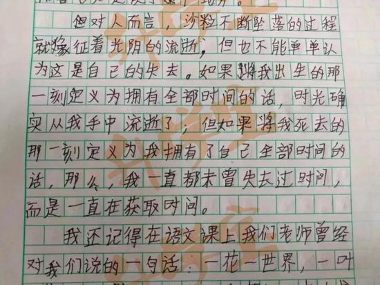 据了解,老师们是去年在网上看到这篇文章的,都读了好几遍。之所以会特别留意,是因为觉得文章写得极富哲理。这次出期末卷,有老师提议用此文出题,立刻获得全票通过。大家都晓得这是一篇小学生写的作文,但也一致认为,小作者很不简单,不仅文字功底扎实,而且文章所表达的思想,尤其是对时间的感悟,已经超越了大多数成年人。
