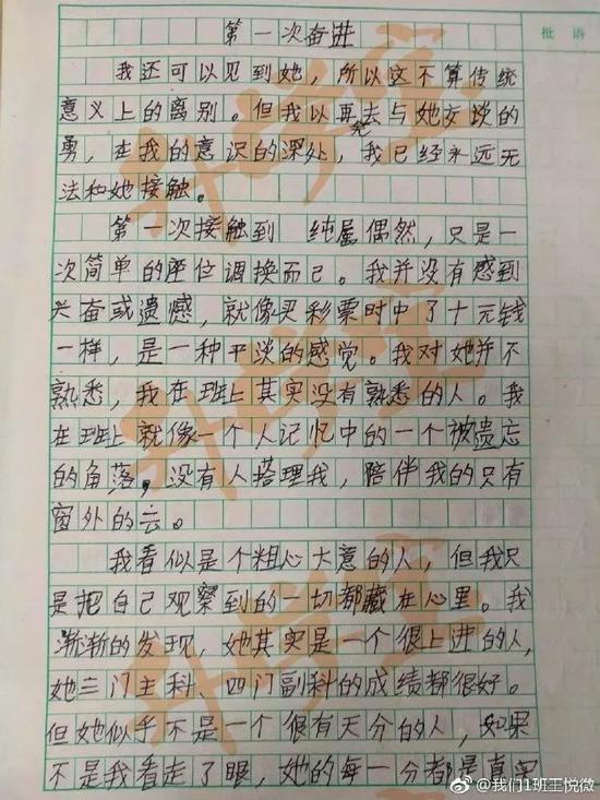 小邵能写出这样的文字,并非妙笔偶得。《沙漏》火了之后,王老师又在微博上分享了小邵写的另一篇作文《第一次奋进》。网友们仔细读完后发现,这篇作文的内容明明就是在讲《第一次暗恋》,而且是不可多得的小学生佳作,童真有趣,又有自己的想法。(上下滚动即可阅读):