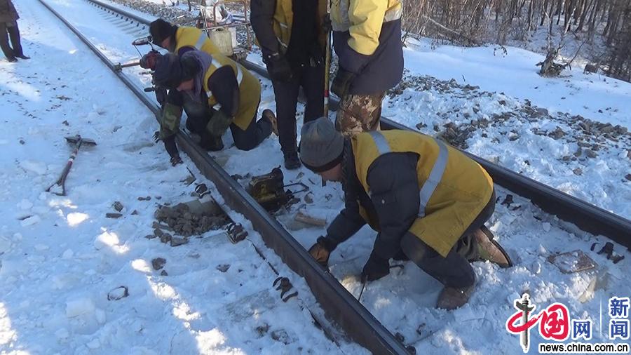 作业过程中,有些职工单膝跪在枕木上,精心检修设备。中国网发 赵强/摄