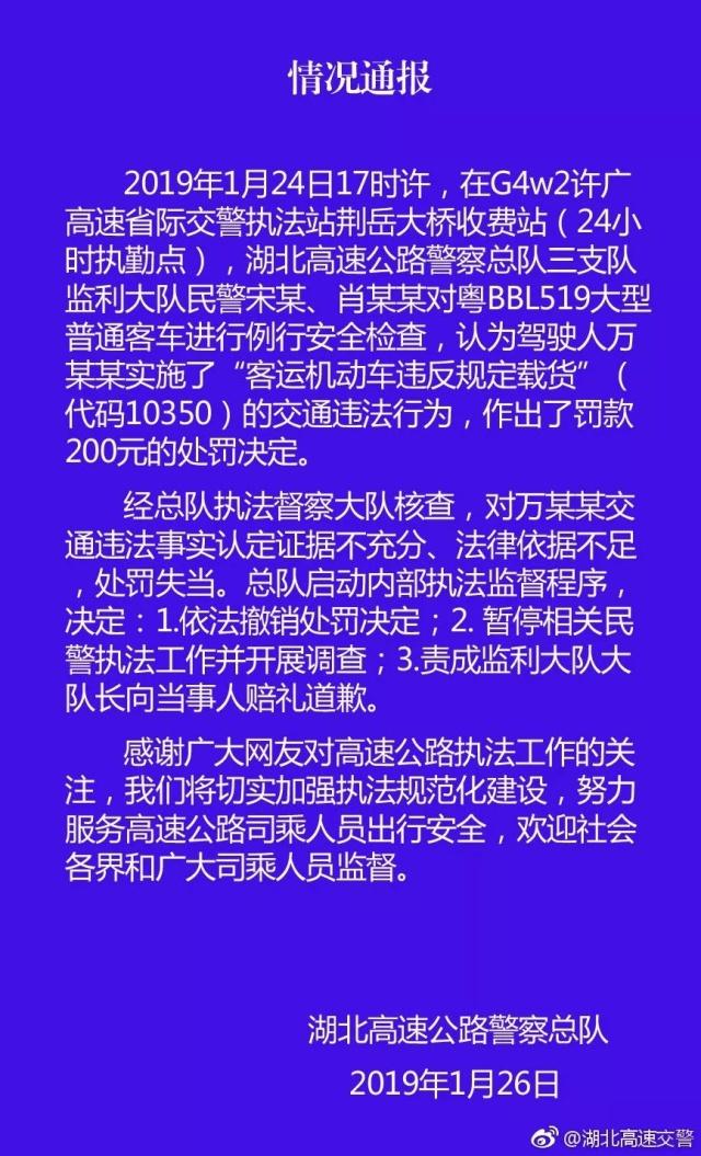 进入春运后,各地交警比平时更加注重道路交通安全。上述事件,大概也与高度重视有关,但这种“重视”似乎有些过头了,也难怪会引发网友热议。好在湖北高速交警“知错就改”,1月27日凌晨及时撤销了不当处罚,暂停相关民警工作,责成有关负责人向当事人赔礼道歉。
