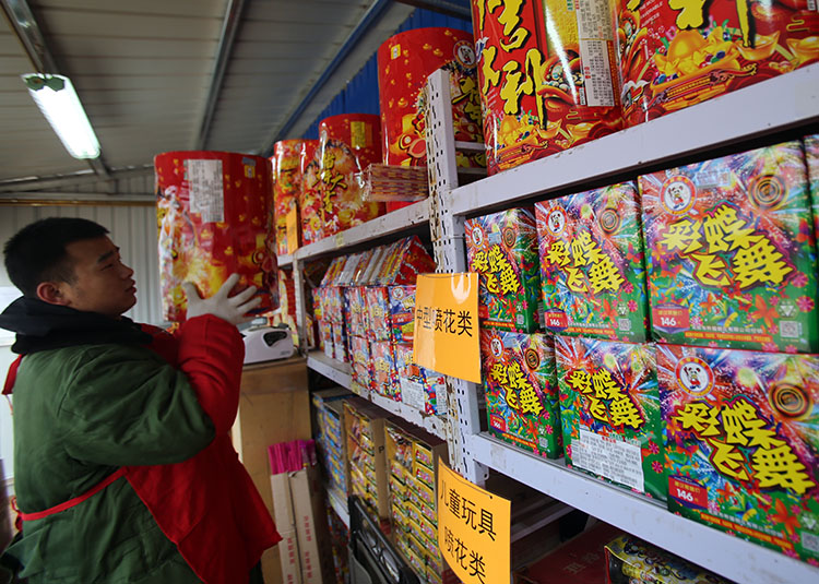 石景山区烟花销售点工作人员将烟花摆放上架。