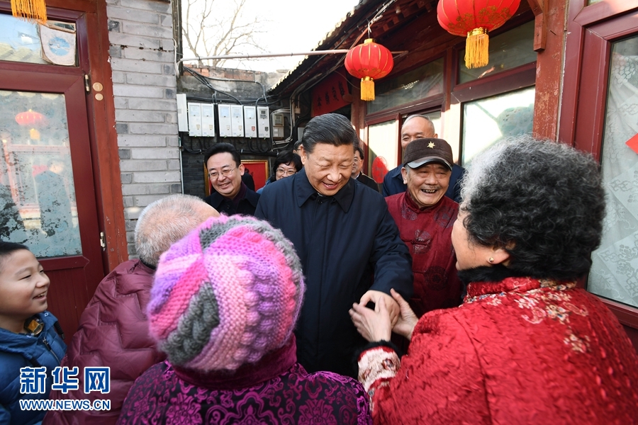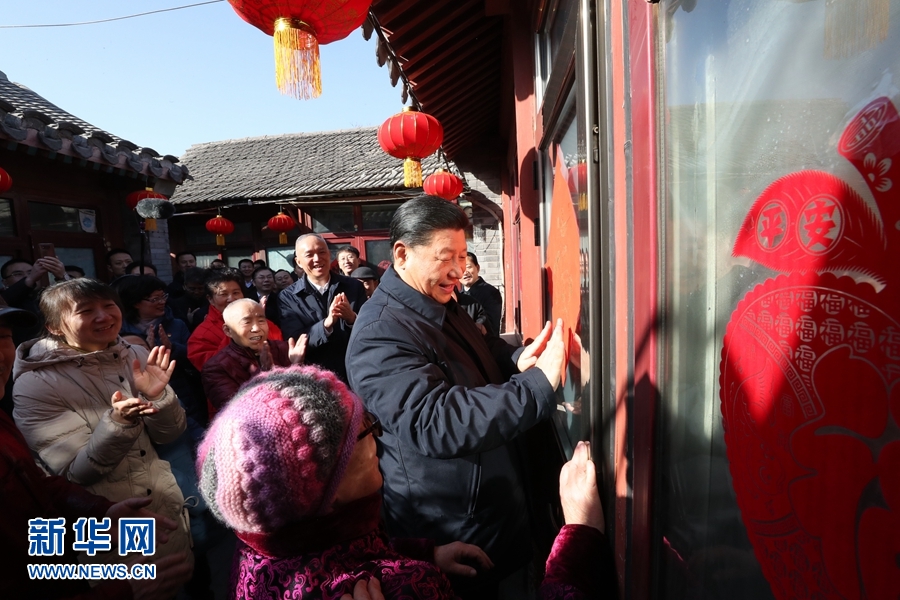 草厂胡同过去居住条件比较差,如今经过改造后,居住环境大为改善,体现了“老北京新气象,老胡同新生活”。习近平先后走进两个居民院落,了解老城区改造后居民住房条件改善情况。看到总书记到来,大家都很激动,纷纷向总书记问好。习近平仔细询问他们日子过得怎么样、冬天用什么取暖、每个月的电费要多少、年货备齐没有,祝愿他们生活幸福。居民侯雅明现场写下一副春联,给总书记拜年。习近平高兴地拿起一幅“福”字,亲自贴到门上,给这里的老街坊们拜年。习近平表示,中国共产党的追求就是让老百姓生活越来越好。在朱茂锦家,习近平同他们一家人包饺子、炸饹馇、聊家常。大家告诉总书记,这些年,老城区改造后居住条件和生活环境大为改善,大家衷心感谢共产党。习近平强调,党中央十分关心老城区和棚户区改造,就是要让大家居住更舒适、生活更美好,解决好大家关心的实际问题,让大家住在胡同里也能过上现代生活。