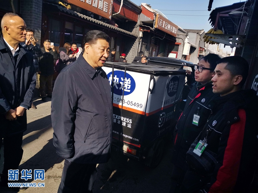 中华民族传统节日农历春节来临之际,中共中央总书记、国家主席、中央军委主席习近平在北京看望慰问基层干部群众,向全国各族人民致以美好的新春祝福。这是2月1日中午,习近平结束在北京市前门东区看望慰问乘车返回途中,特意走进位于前门石头胡同的快递服务点,看望仍在工作的“快递小哥”,了解他们工作和生活情况。 新华社记者 王晔 摄