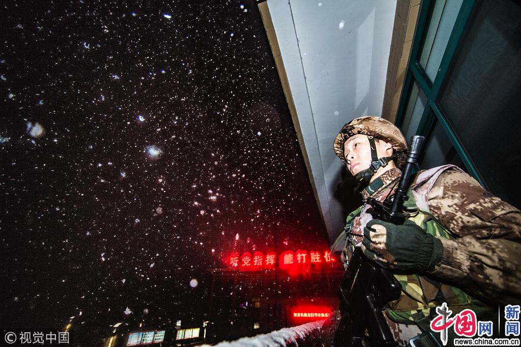 受冷空气影响,近日我国部分地区持续大雪,特别是长江沿线,伴随着大雪的来临,气温也降至冰点。2019年2月8日,江苏某部新兵在风雪中迎来第一班夜岗。亓创/视觉中国