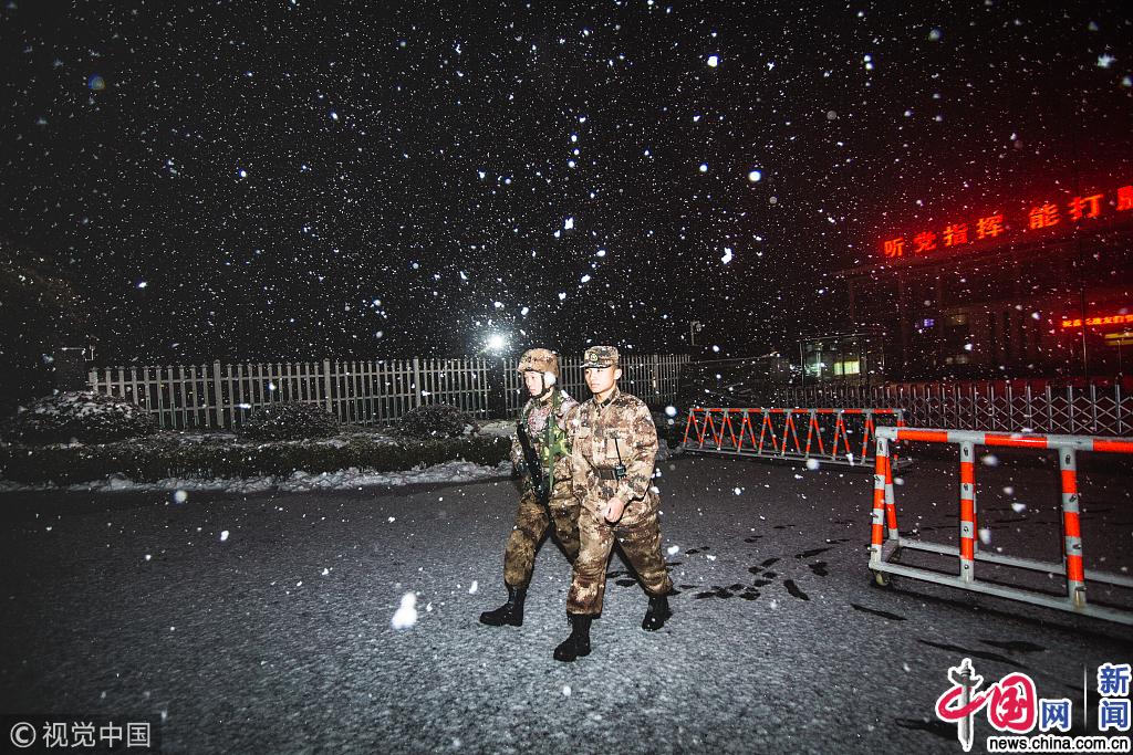 2019年2月8日,江苏某部新兵迎来第一班夜岗,天气预报显示,当晚将有暴雪来临。亓创/视觉中国