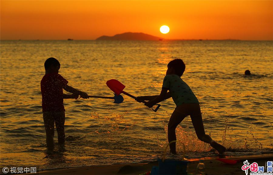 2019年2月16日,海南三亚,两名小朋友在三亚湾海边玩耍。不二/视觉中国