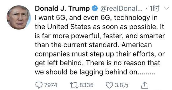 特朗普在推特上说:“我希望美国尽可能快地发展5G,甚至6G技术,那会比当前的标准更强、更快、更智能。美国公司必须加紧努力,否则就会落后。在那些明显代表未来的领域,美国没有被人甩在身后的理由。我希望美国公司能够通过竞争去获胜,而不是靠封杀当下更先进的技术。不论在我们从事的哪个领域,美国都必须是领导者,尤其是在令人兴奋的科技世界!”