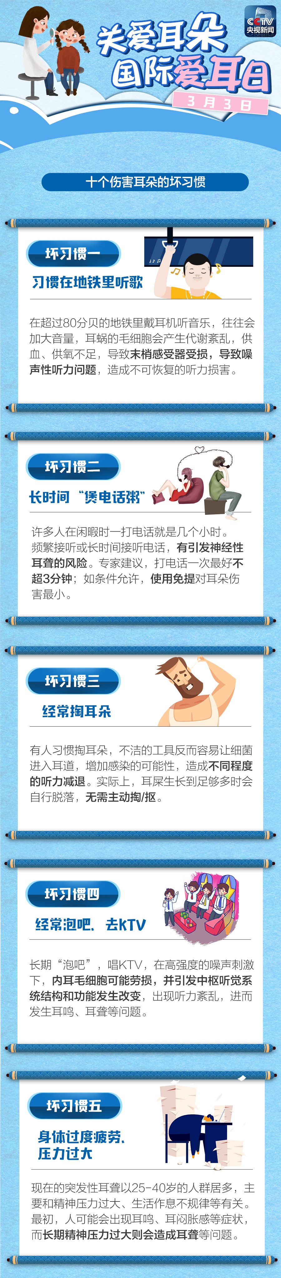 耳朵对人的重要性不言而喻,但作为人体最敏感的器官之一,我们很多不良的生活习惯都会对它造成不可逆转的伤害。今天(3月3日)是国际爱耳日,一张图让你知道怎样保护自己的耳朵!