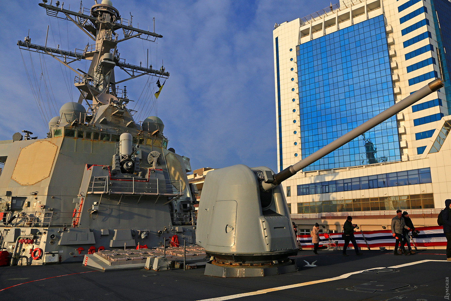 日前,乌克兰国内媒体展示了乌克兰记者在敖德萨港登上美国海军导弹驱逐舰DDG75唐纳德库克号上进行参观的照片。俄罗斯媒体称,这是在向俄罗斯示威。