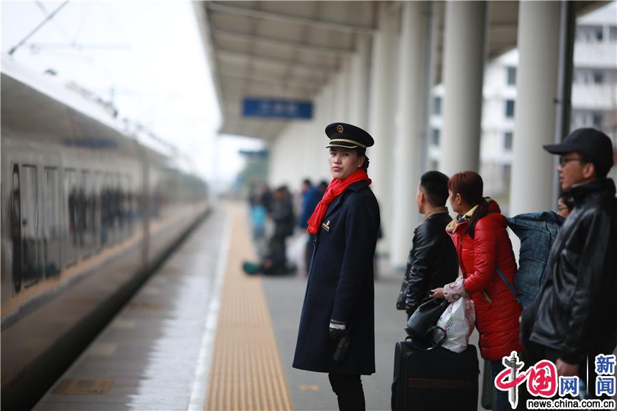 图为藏族客运员仁真那么在站台上组织旅客乘车。中国网发 苏志刚/摄