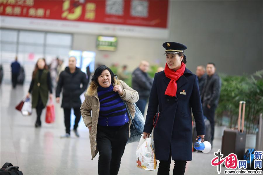 图为藏族客运员仁真那么帮助重点旅客。中国网发 苏志刚/摄