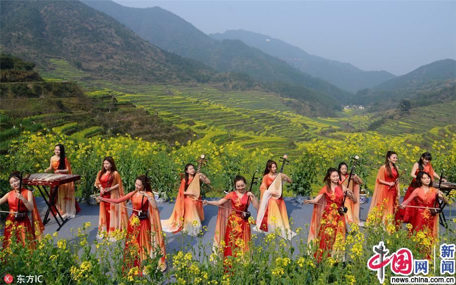 2019年3月11日,女子十二乐坊在江西婺源县篁岭古村梯田油菜花海中演奏民乐。近日,随着各地气温不断升高,梅花、桃花、迎春花等各种鲜花逐渐开始怒放,又一年踏青赏花季来临,还不趁着春光灿烂的日子,和家人、和朋友、和恋人一起畅游花海,错过花季,错过阳光,可又要等一年。胡敦煌/东方IC