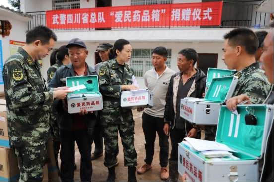 医疗队给彝族老百姓发放“爱心药品箱”。李华时 摄