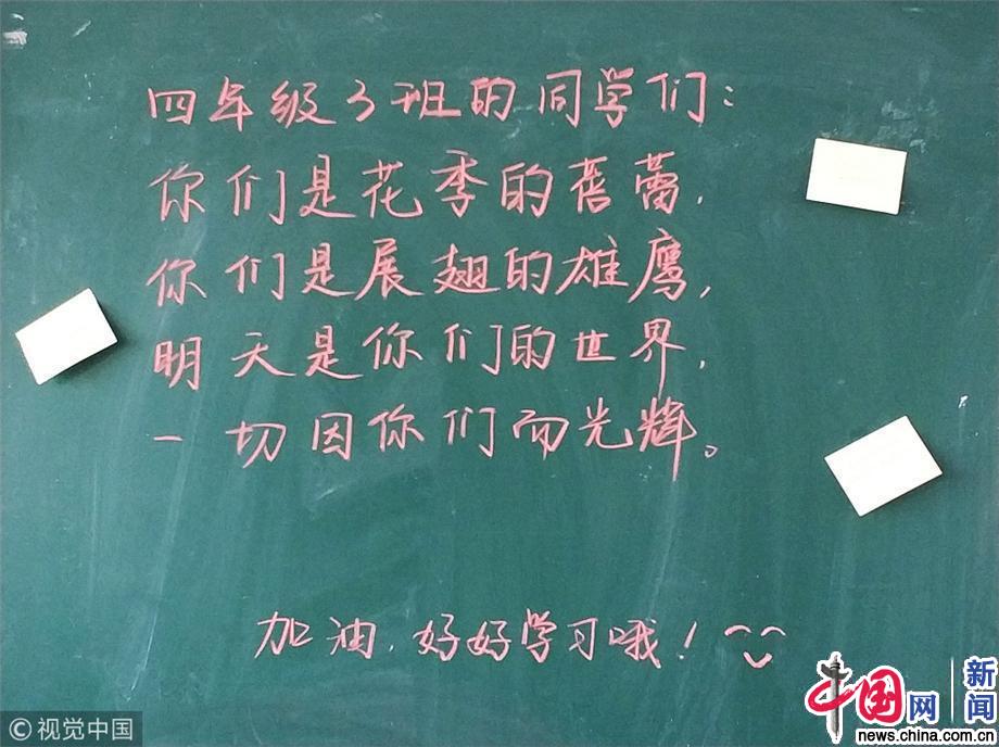 2019年3月24日,江苏盐城陈家港镇中心小学,武警部队官兵给小学留下“爱心贴纸”和话语。视觉中国