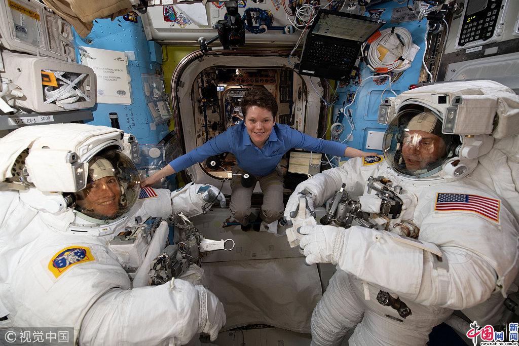 当地时间2019年3月18日,国际空间站,即将进行的一系列太空行走之前,美国宇航局宇航员麦克莱恩(中间)协助宇航员克里斯蒂娜·科赫(左边)和尼克·海格(Nick Hague)(右边)验证他们的美国宇航服的尺寸是否合适。NASA/视觉中国