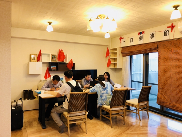 中国驻福冈总领馆工作人员在冲绳“一日领事馆“活动现场办公。(图片由中国驻福冈总领馆提供)