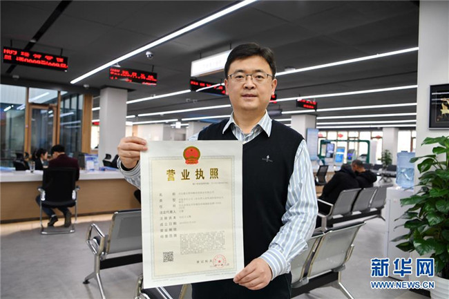 一家入驻雄安新区的企业工作人员在市民服务中心内展示办理的营业执照(1月17日摄)。新华社记者 牟宇 摄