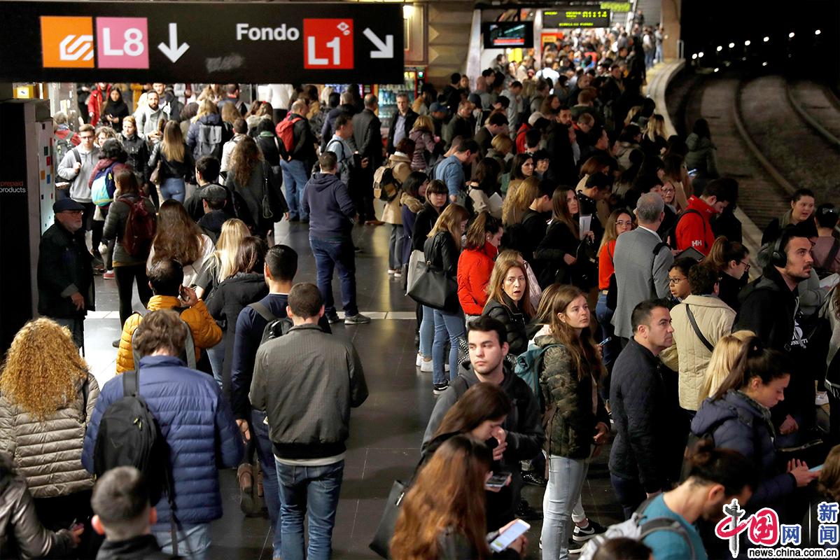 当地时间2019年4月8日,西班牙巴塞罗那,乘客挤爆地铁站。巴塞罗那地铁工作人员正举行罢工,抗议在基础设施建设中出席致癌材料石棉。