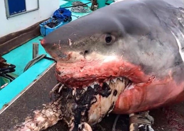 这些可怕的照片显示,这头4500磅重的鲨鱼满身是血