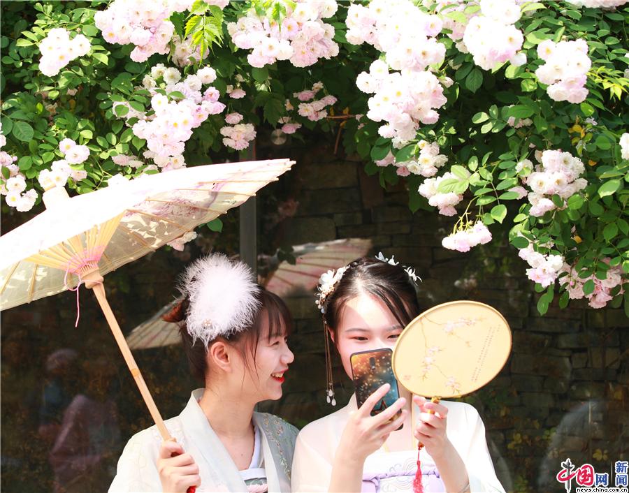 中国网4月28日讯 近日,南京老门东景区的几处蔷薇花陆续盛开了,女孩们以花为景拍照,玩得不亦乐乎。美丽的女孩,漂亮的汉服,盛开的蔷薇构成了一幅浪漫的画卷。