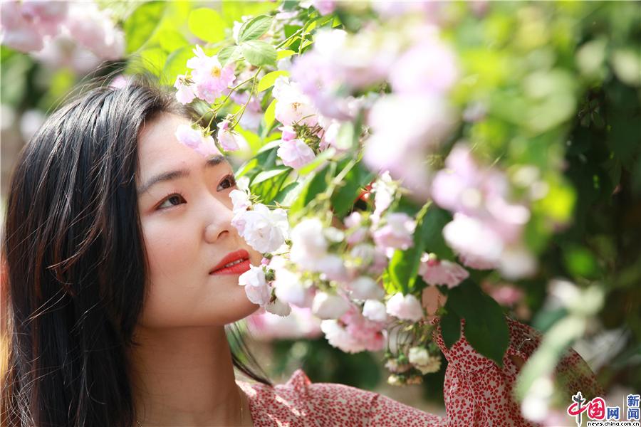 4月27日,江苏省南京市,老门东景区的几处蔷薇花盛开,女孩以花为景拍照。姚家\东方IC