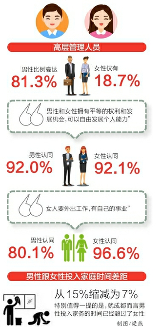 报告显示,在性别观念的认同度比较上,围绕“男性和女性拥有平等的权利和发展机会,可以自由发展个人能力”和“女人要外出工作,有自己的事业”这两个话题,女性调研对象认同度分别达到92.1%和96.6%,男性对此的认同度也达到92.0%和80.1%,反映出传统上以男性为主的观念正在被颠覆,不仅女性意识逐渐觉醒并付诸行动,男性也开始认同两性均等的社会家庭贡献机会。