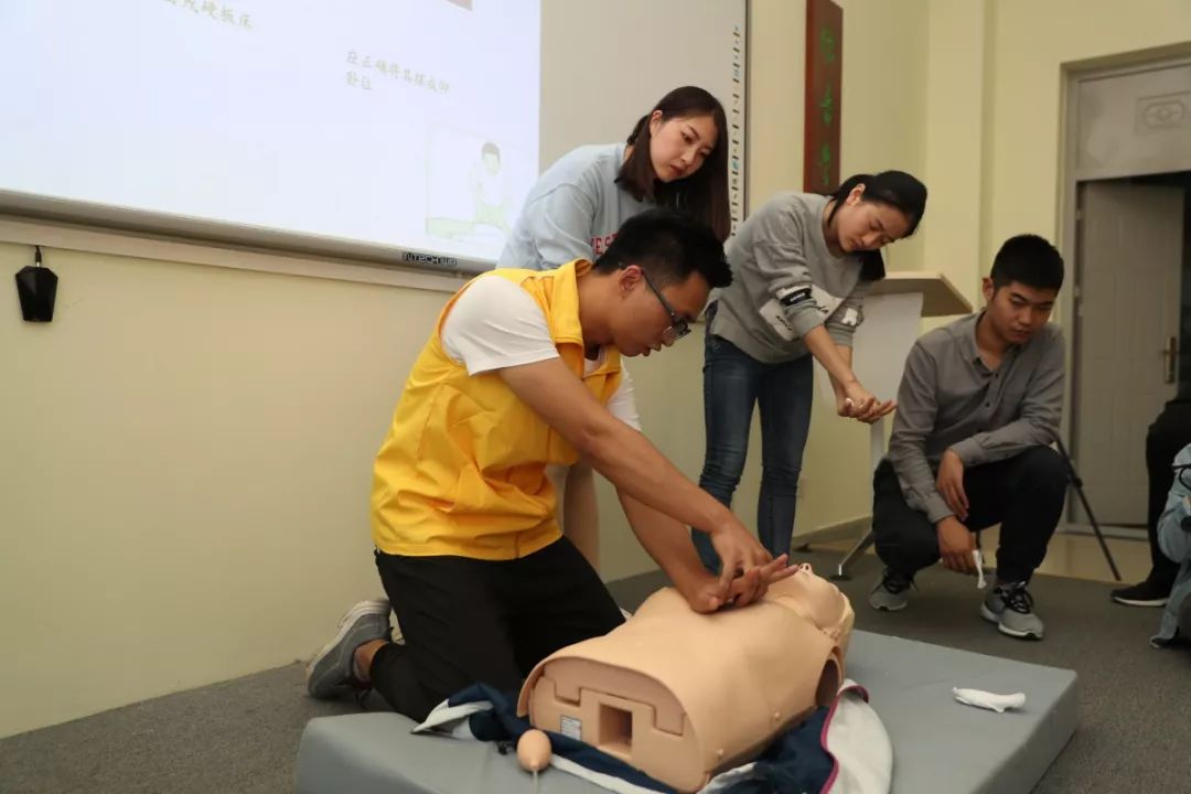 山东大学中心校区,医院CPR(心肺复苏术)志愿服务队的队员们正在手把手地给大学生们教授标准的心肺复苏术。双臂伸直,双手相扣,手指翘起离开胸膛,以每分钟100-120次的频率不间断按压……