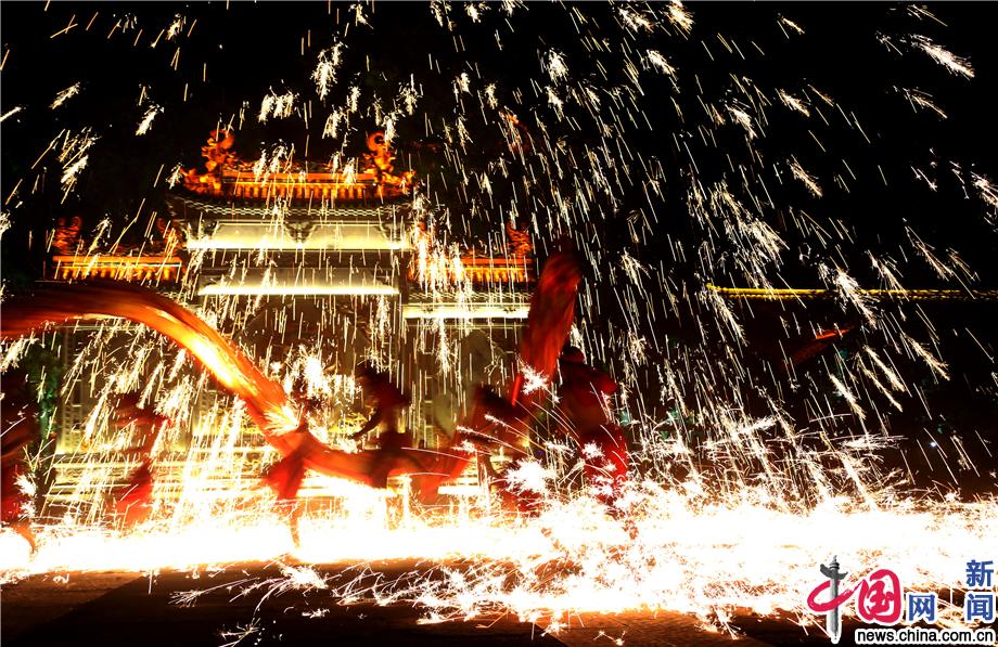 2019年5月2日晚,“五一”小长假期间,位于京杭大运河畔的山东枣庄台儿庄古城民间艺人表演的“火龙钢花”,钢花飞舞,勾勒出“人在龙中舞,龙在火中飞”的精美画卷,让游客近距离感受传统非物质文化遗产的魅力。“火龙钢花”是我国首批非物质文化遗产项目。吉喆/东方IC