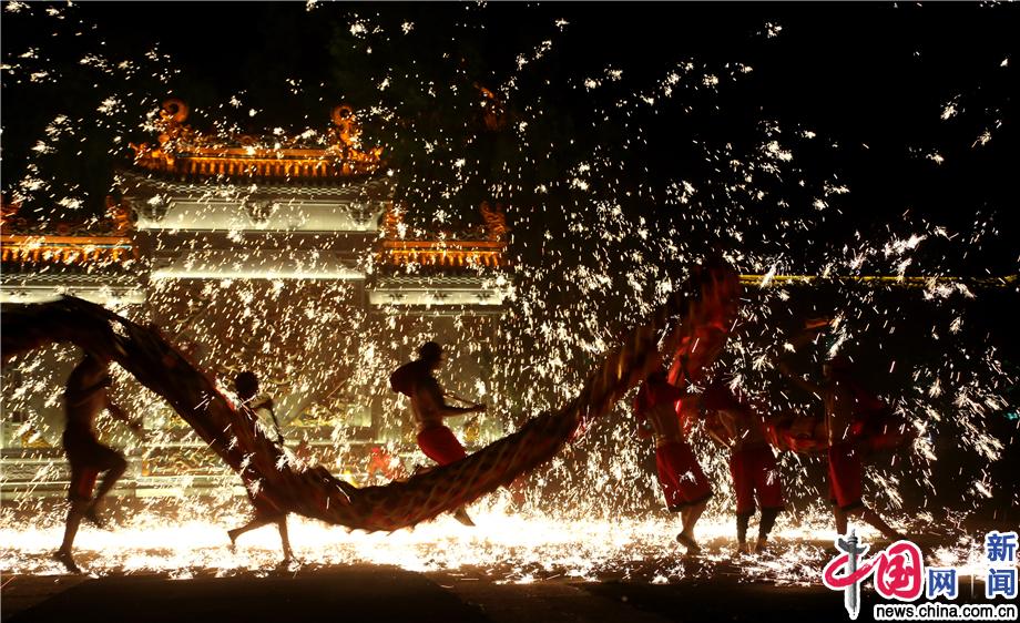 2019年5月2日晚,“五一”小长假期间,位于京杭大运河畔的山东枣庄台儿庄古城民间艺人表演的“火龙钢花”,钢花飞舞,勾勒出“人在龙中舞,龙在火中飞”的精美画卷,让游客近距离感受传统非物质文化遗产的魅力。“火龙钢花”是我国首批非物质文化遗产项目。吉喆/东方IC