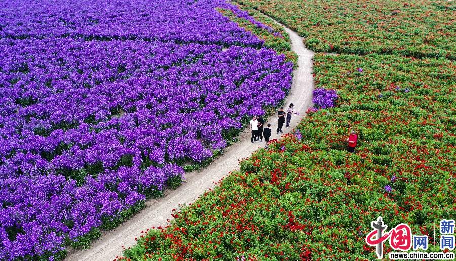 2019年5月14日,在安徽省亳州市谯城区十河镇西关村药都四季花海,游人在盛开的鲜花丛中赏花拍照(无人机航拍)。刘勤利/摄 东方IC